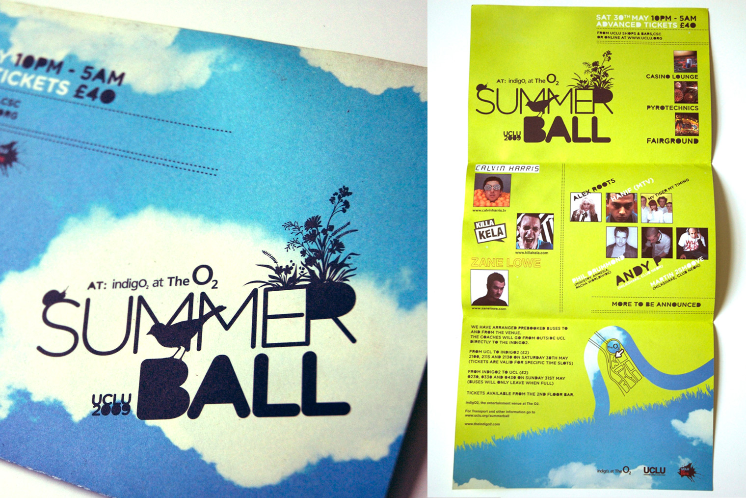 Commissioned by a small team with enough creative space to explore what could be produced on a tiny budget.Overall event branding including logo, gate-fold A5 flyer, printed vinyl for the outside of lifts, website elements, and tickets. Super 8 inspired colours created by an over-saturated image with lots of noise, contrasting with strong garden vector elements.