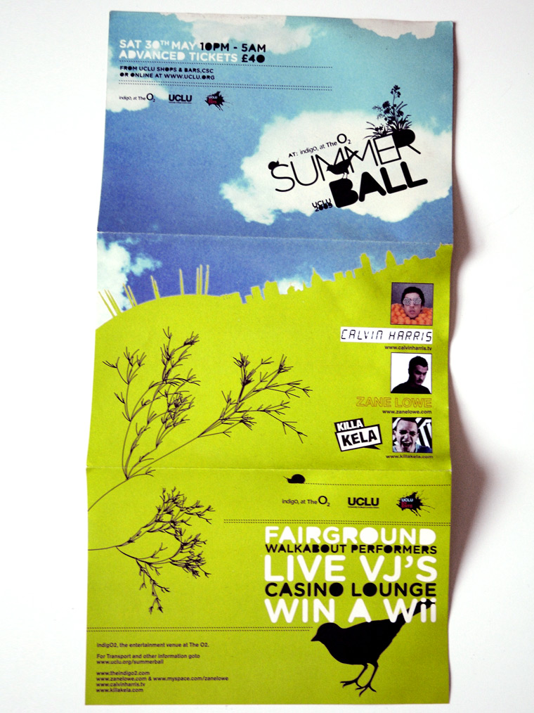 Commissioned by a small team with enough creative space to explore what could be produced on a tiny budget.Overall event branding including logo, gate-fold A5 flyer, printed vinyl for the outside of lifts, website elements, and tickets. Super 8 inspired colours created by an over-saturated image with lots of noise, contrasting with strong garden vector elements.